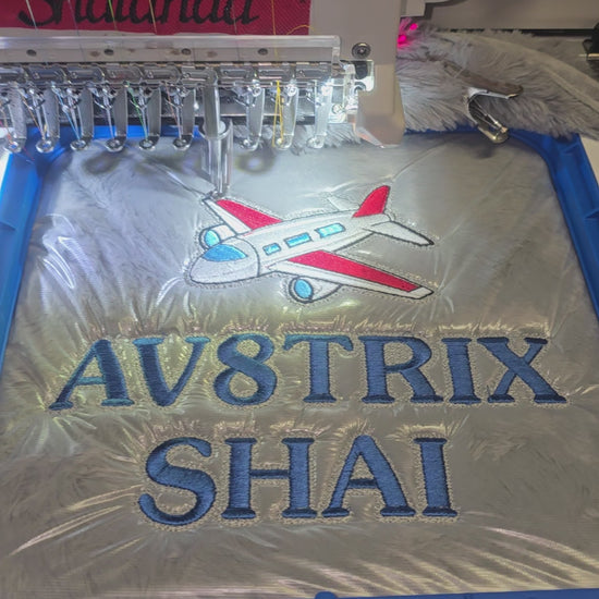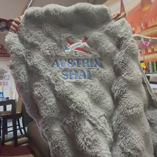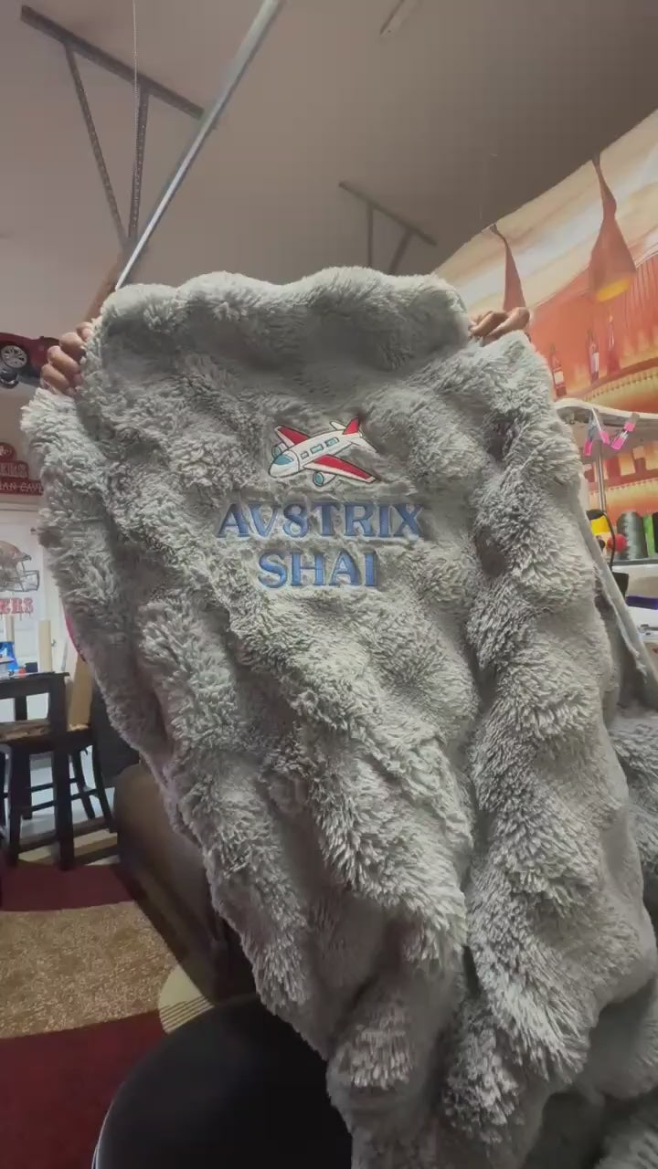 50x60" fluffy customized fleece throw blanket. Personalized by embroidered name (2 Lines )which will be approx 8" long. You may upload a logo or image that can be embroidered. You may select up to 3 colors, one for bottom stich and colors for name stitch.